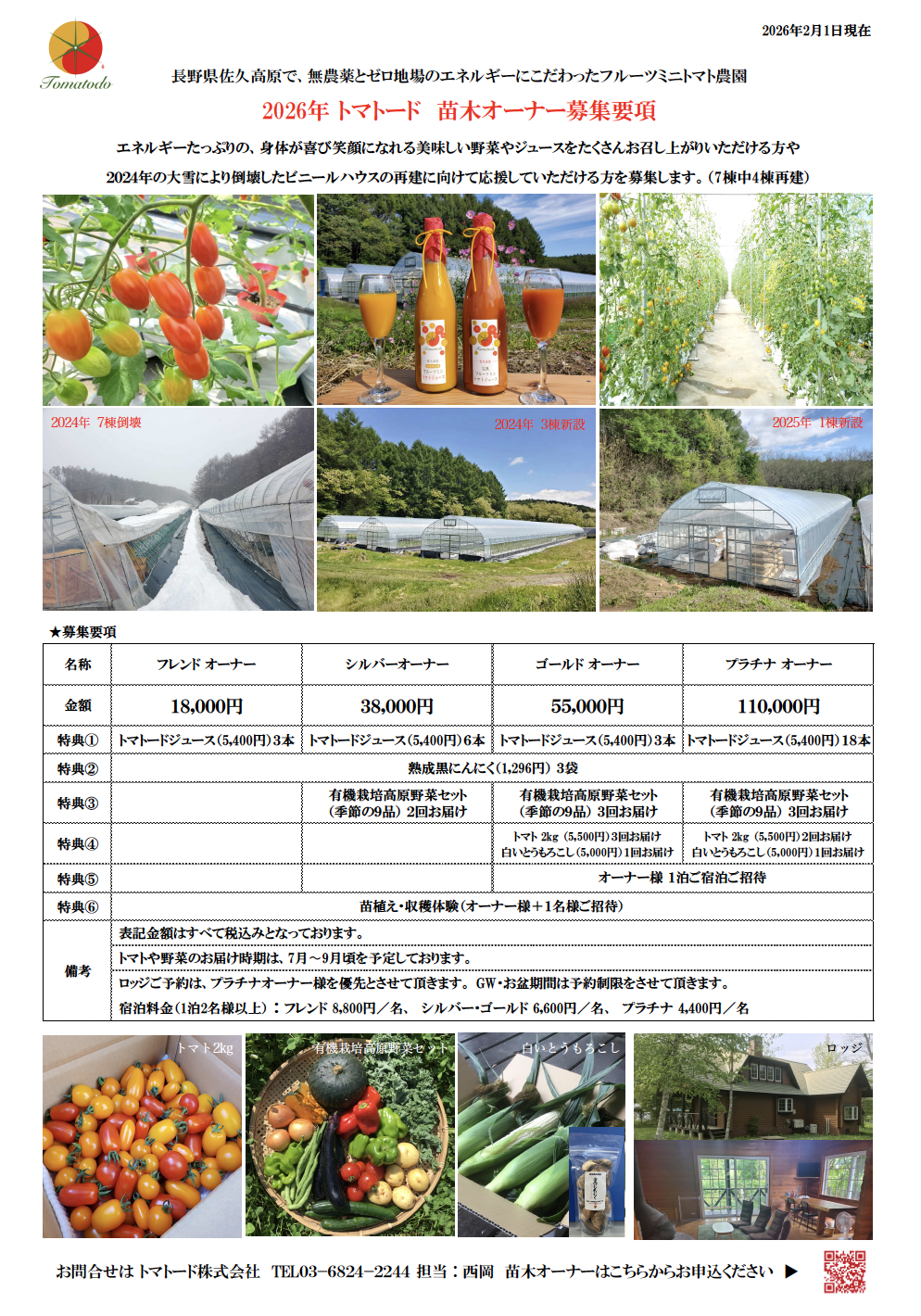2026年 🍅苗木オーナー募集! 2024年2月5日の大雪でビニールハウス全7棟が倒壊(。>﹏<。) 2024年に3棟、2025年に1棟を新設。 復興途中の農園を応援して頂ける方を募集します! 一人でも多くの方に、身体が喜び笑顔になれる美味しい高原野菜と🍅ジュースが届けられるよう スタッフ一同頑張りますので応援よろしくお願いいたします(^_^)v おすすめの関連記事 HPがオープンいたしました! 伊勢丹オンラインストアでの販売がスタートします。 『エクシブ軽井沢マルシェ』へ出店致します! 『グランドエクシブ軽井沢の朝食』に採用されました! 前の記事へ トマトードへのご予約・お問い合わせはこちら お電話でのお問い合わせ 受付/10:00~16:00 03-6824-2244タップで電話をかける メールでのお問い合わせ 24時間受付中 今すぐお問い合わせください! メールでお問合せする 所在地